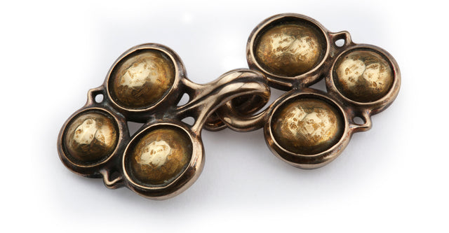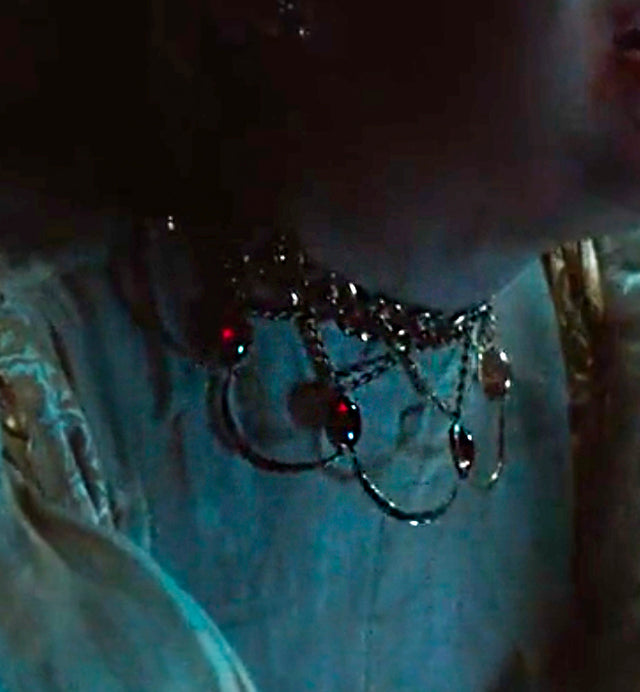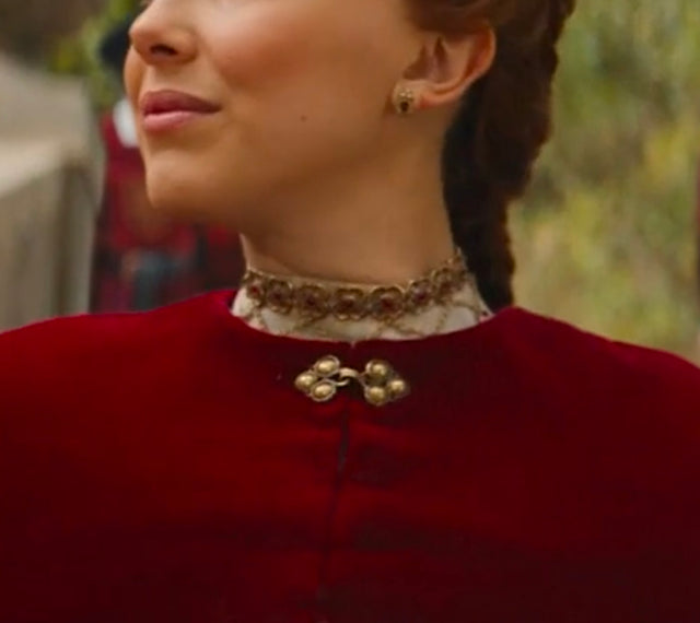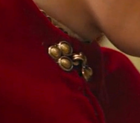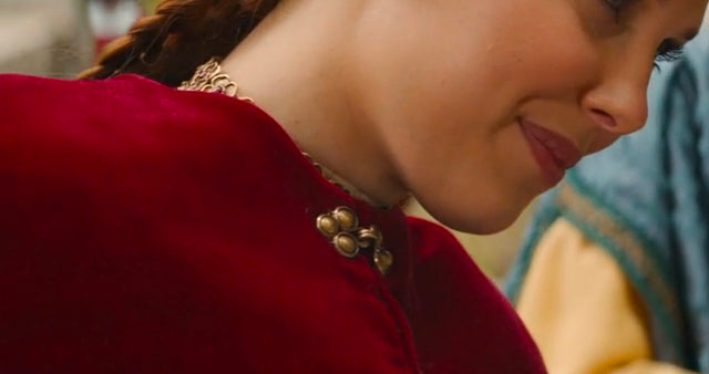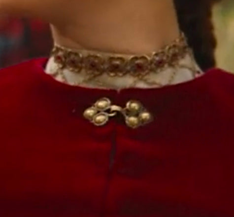 One of the reasons we love doing film work is the creative problem solving it involves. The initial design for the brooch used round cabochon cultured rubies set into a three stone pattern. It had hooks so it could be sewn from behind with button loops onto Princess Elodie’s cloak.