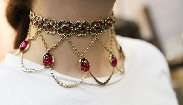 Overlapping photos of film production concepts. A drawing of the Actor Millie Bobby-Brown wearing ornate gold jewellery from the movie Damsel. Other pictures of the necklace designs from the movie.