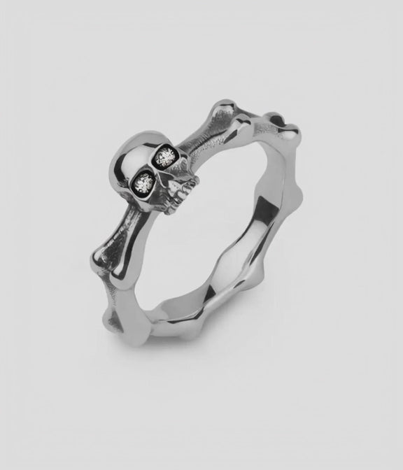 A very welcome addition to our iconic Skull jewellery collection which we have been building up for years and which we will never stop making. This is a very beautifully made ring and can have diamonds or other gemstones added to the eyes for that extra special bit of fabulousness. There is a marvellous bone band and plain skull ring which can be stacked with this design.