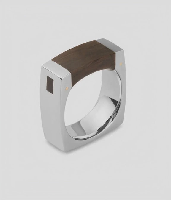 Sculptural elegance, inspired by and made using a mortice joint technique. Handmade using our exclusive 2000 year old London Oak Oak sourced from the first London port facilities built by the Romans around 63AD and combined with solid recycled sterling silver and lovely yellow gold pins.